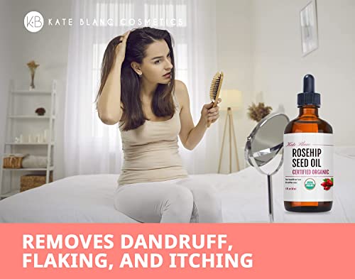 REMOVE DANDRUFF: Cold pressed mosqueta rose hip oil is also great for hair and nails. Rose hip oil can reduce dandruff's flaking and itching. Kate Blanc's Rosehip Seed Essential Oil is Certified Organic and is paraben free and cruelty free. It is a great beauty oil and can also be used as a moisturizing cream, hair growth serum, and natural scar removal.
