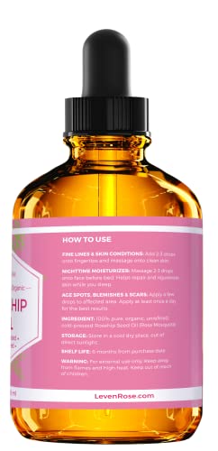 Olio di semi di Rosehip da Leven Rose - 100% Pure Organic Olio anti invecchiamento privo di pressione fredda per la pelle e le unghie - 4 once