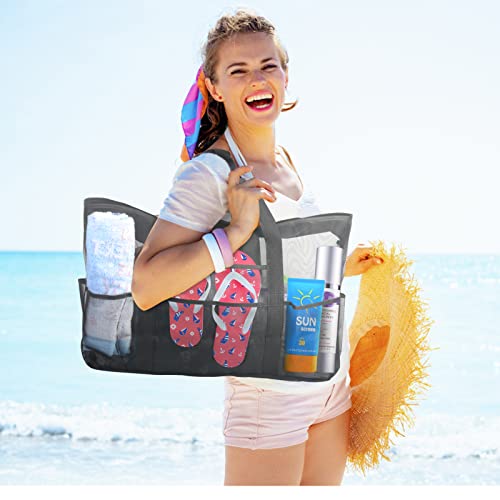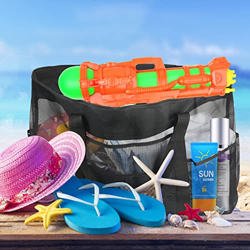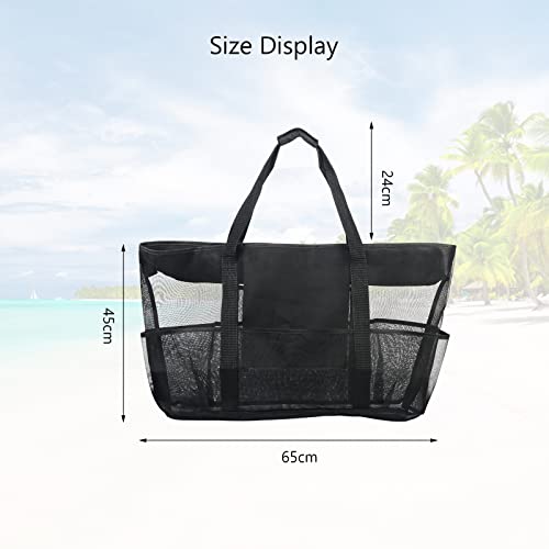 Alta capacità: la dimensione della borsa da bagno in rete nera è 24x38x56 cm/9,45x14,96x22,05 pollici, ovvero 52L. Totale 6 tasche esterne per bottiglie d'acqua, occhiali da sole, infradito, crema solare, cuffie da nuoto, ombrelli, 1 grande tasca per asciugamani, vestiti e cappelli da sole e 1 piccola tasca interna per telefono, chiavi e portafoglio.