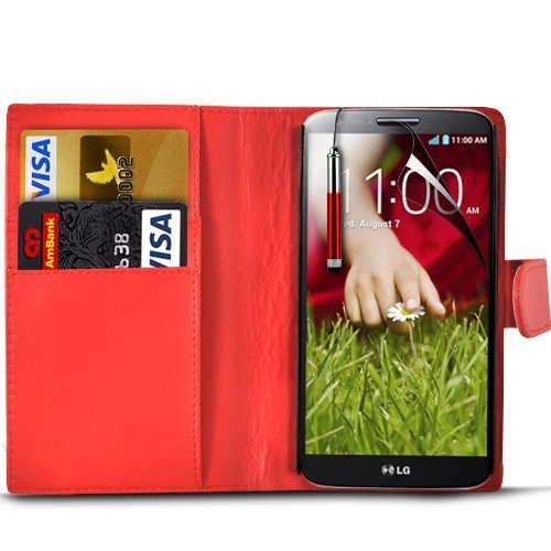 Rosso - LG G2, D802 Elegante in ecopelle Debito / Carta di Credito Slot Stile libro Wallet Custodia Pelle coperchio apribile Capacative Stilo Touch Screen & LCD Screen Protector Guard da * Aventus *