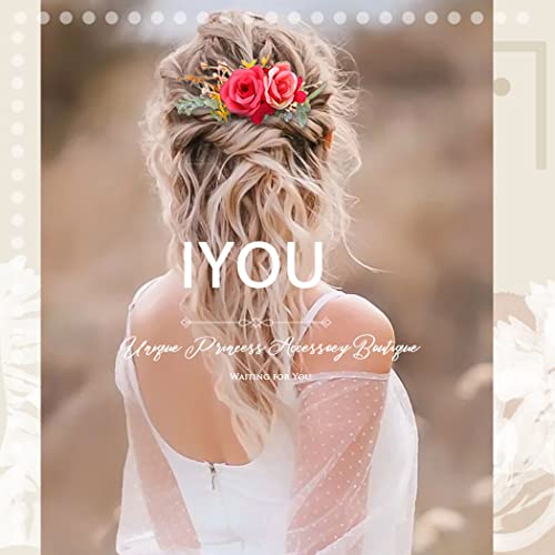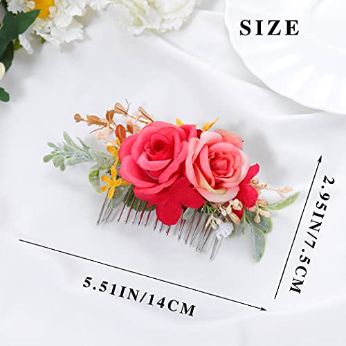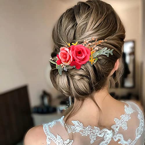 IYOU Rosso Nuziale Pettine Artificiale Fiore Copricapo Le Foglie Ballo Studentesco Spiaggia Nozze Lati Pettini Vestito per Capelli Accessori per Sposa e Damigella D'onore