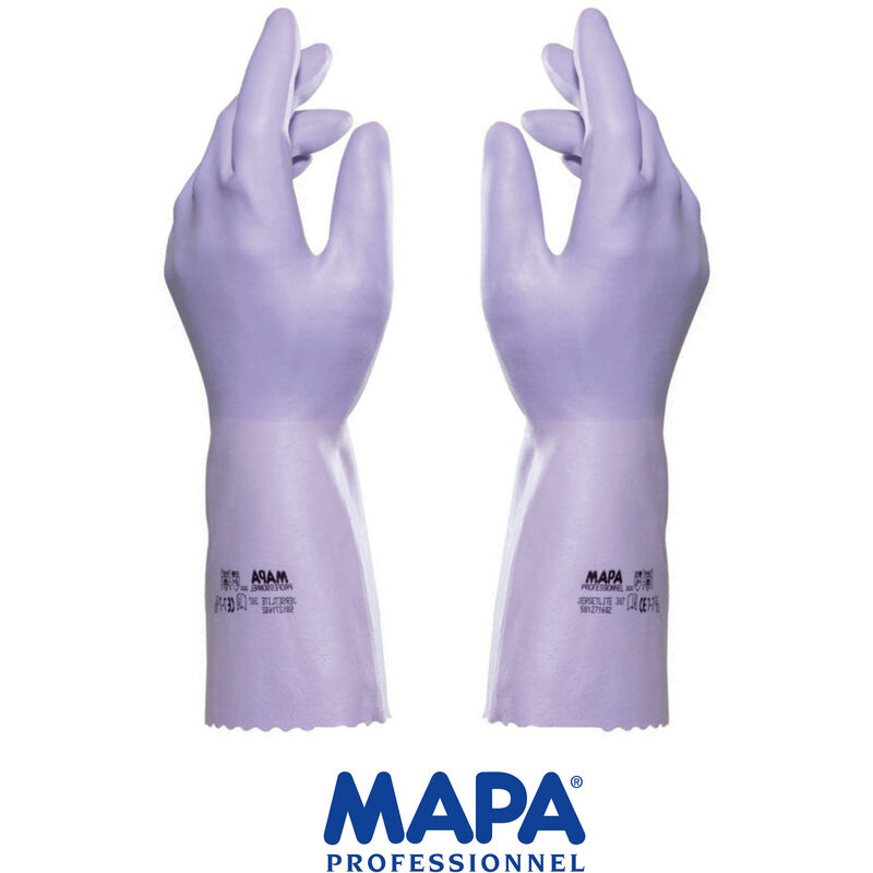 Guanti MAPA JERSETTE LIGHT VIOLA taglia (6/7/8/9) Lattice naturale, interno con supporto cotone. Comfort unico: finezza del supporto tessile, forma anatomica. Adatti al contatto con l'acqua e i prodotti correnti per le pulizie. Resistenza meccanica accresciuta dalla presenza del supporto tessile. Spessore 0,75 mm