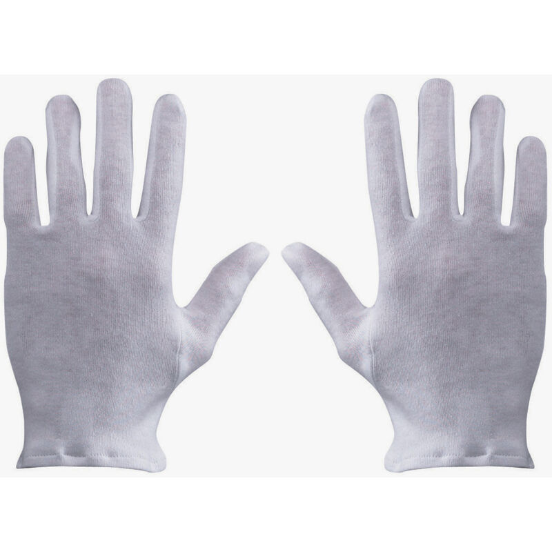GUANTI CAMERIERE Cotone a maglia, dita a soffietto, leggero, bianco, lavorazione cucita, bordo orlato. Lunghezza 220mm.