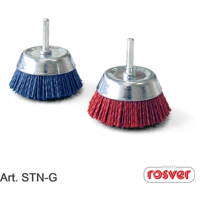 Spazzole in Nylon a Tazza con Gambo Rosver STN D.70 G.6 Conf.10pz Il filo di nylon è più flessibile e resistente alla rottura del filo d'acciaio. Graffia meno e non fa arrugginire il pezzo lavorato. Sui metalli rimuove l'ossido e i residui di vernice, sui legni prepara la superficie. MISURA GAMBO 80 180 70 6 7,53 7,53 10
