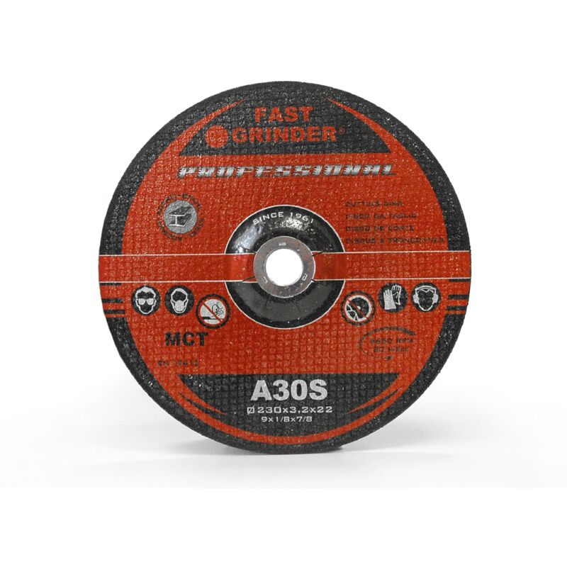 Mole Taglio MCT-PRO A30S ferro - Dischi a centro depresso - Rosver A30S: Per materiali ferrosi e bassolegati, sezioni sottili, lamiere, tubi, profilati, ghise comuni, leghe non ferrose. MISURA FORO A30S 115x3,2 22 0,93 50 125x3,2 22 1,12 50 230x3,2 22 2,50 25