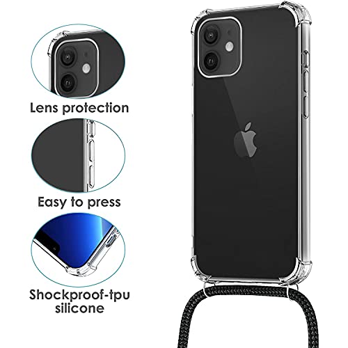 Rosyhulle Cover Compatibile con iPhone 12/ iPhone 12 Pro con Cordino, Trasparente Custodia per iPhone 12 Pro/ 12 con Collana Laccio Tracolla, Morbido Silicone TPU Gel Antiurto Protettiva Case Nero