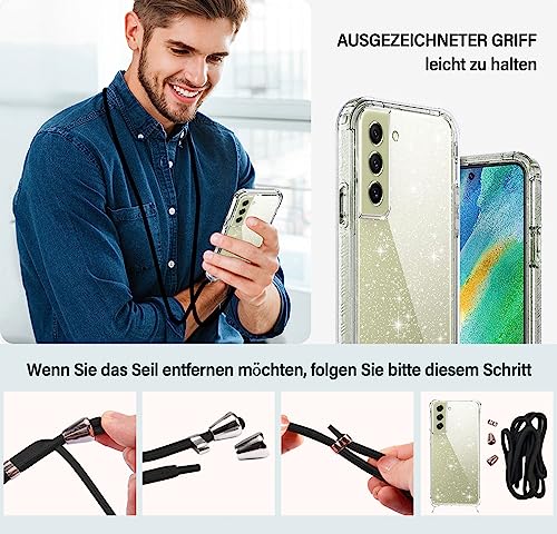 Rosyhulle Cover Glitter per Samsung Galaxy S21 Fe 5G con Protezione Schermo, Trasparente Silicone Custodia con Cordino per Samsung S21 Fe, 360 Gradi TPU Antiurto Protettiva Case con Collana Nero