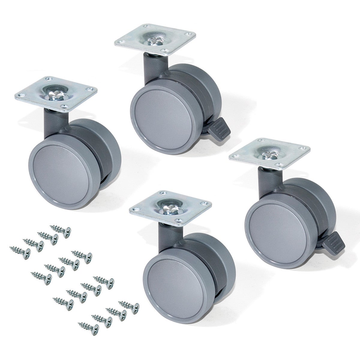 Kit composto di 4 ruote: 2 con freno e 2 senza freno. Portata massima 50 Kg per ruota. Perfette per mobili di casa, camere, camerette e per cassettiere di mobili di ufficio.. Facili da installare, queste ruote permettono di ottimizzare e migliorare i tuoi mobili. E grazie ai loro cuscinetti a sfere permettono un movimento morbido e silenzioso.. Piastra per avvitare al mobile in acciaio zincato e viti di montaggio incluse.