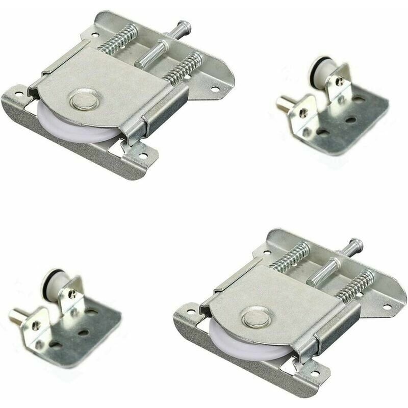 Il pacchetto include: 2 ruote per porte scorrevoli e 2 parti di montaggio. Materiale di alta qualità: realizzato in ferrolega ad alta durezza, materiale spesso, non facile da deformare, robusto, durevole, resistente all'usura e alla corrosione. Design della puleggia: che fornisce una migliore vestibilità e una scorrevolezza più fluida, stabile e sicura da usare. Questi accessori facilitano l'apertura della porta dell'armadio.,Funzionamento silenzioso: insieme al tampone di smorzamento, funzionerebbero in modo silenzioso e solido, proteggendoti da rumori forti e potenziali lesioni dovute all'improvviso sbattere della porta. /> Ampio utilizzo: si adatta a porte scorrevoli di armadi, finestre, armadi, credenze, vetrine e scarpiere, armadietti, ecc. Ed è un sostituto ideale per i rulli tradizionali.