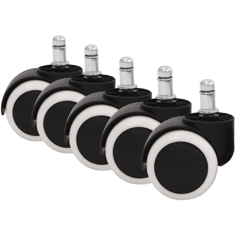 Questo set di ruote per pavimenti duri comprende 5 ruote per sedie da ufficio. Le ruote hanno un bullone da 11 mm e un diametro di 48,5 mm. Raccomandiamo queste ruote per l'uso su pavimenti duri (ad es. pavimenti in marmo e pietra). Specificazioni: Colore: Nero e bianco Materiale: PU Diametro: 48,5 mm Bullone: 11 mm Assemblaggio richiesto: No La consegna include: 5 Ruote SKU: 180048