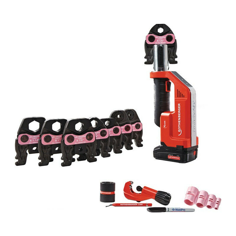 Pressa elettroidraulica senza fili per pressatura dipendente dal sistema di raccordi >B< MaxiPro da Ø 1/4 a Ø 1,1/8 pollici · nel set ROCASE cliccabile composto da: ROMAX Compact TT, ganasce di pressa, tagliatubi, sbavatura, sbavatura interna/esterna, marcatore Altre caratteristiche tecniche: · Larghezza: 390mm · Spazio di lavoro: 1/4-1.1/8' · soggetto a ispezione: sì