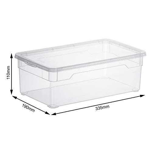 Dimensioni: 33 x 19 x 11 cm (LxPxA), dimensioni interne: 31 x 17,1 x 10,5 cm (LxPxA) - in plastica di alta qualità (PP) - set da 4 - volume 5 litri - colore: trasparente - ideale per le scarpe