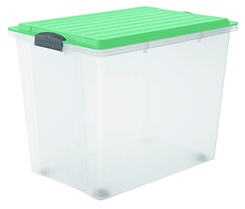 Dimensioni esterne: circa 57 x 40 x 43,5 cm (lunghezza x larghezza x altezza). Volume: circa 70 l, colore: scatola di plastica trasparente, coperchio e chiusura verde - offre molto spazio.