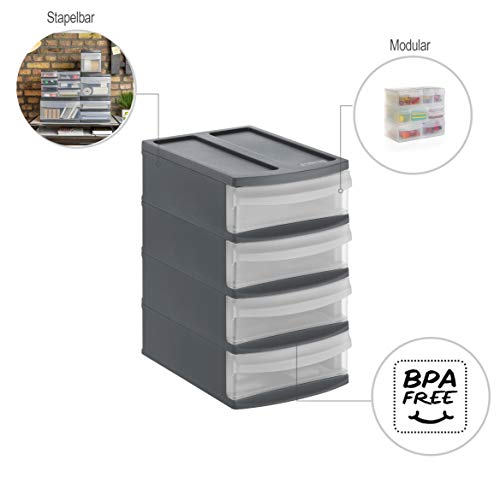 Rotho Systemix Cassettiera a 4 cassetti in plastica (PP) senza BPA antracite/trasparente XS/A6 (19,6 x 14,1 x 23,3 cm)