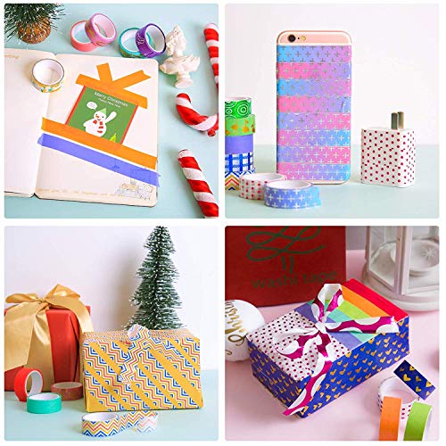 Design unico: la confezione include 10 nastri washi in tinta unita e 20 nastri in lamina d'oro con motivo di 5 fogli di colore argento, oro, rosso, blu, verde.