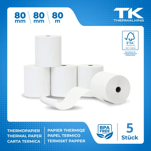 Rotoli termici 80mm x 80m x 12mm per registratore di cassa fiscale - Rotolo di carta termica per stampante 80x80x12 BPA Free (5 Rotoli termici)