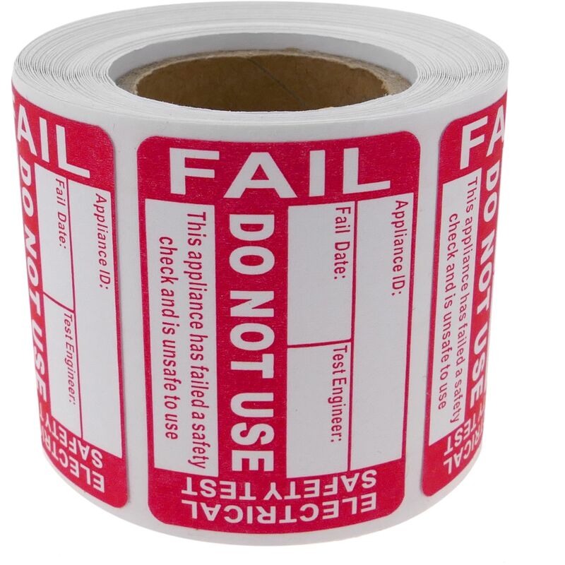 Rotolo da 200 etichette adesive permanenti rettangolari bianche con bordi arrotondati, dicitura FAIL / PROVA DI SICUREZZA ELETTRICA / NON UTILIZZARE e foglio di prova rosso. Etichetta per informare, avvertire e segnalare al consumatore che l'oggetto non ha superato le prove elettriche. Perfetto per l'aggancio a macchine, dispositivi, installazioni, targhe, pacchi, buste, invii, ecc. Caratteristiche del prodotto: CARATTERISTICHE: Etichetta rettangolare con superficie bianca e informazioni di prova in rosso. Tirare per etichettare tutti i tipi di oggetti e informare l'utente che l'oggetto, il dispositivo o l'installazione non ha superato i test elettrici eseguiti. Include un adesivo permanente, sul retro, difficile da rimuovere. DESIGN: etichetta rettangolare con superficie bianca e testo informativo sul test rosso. IDEALE: Per uso commerciale, centrale e industriale su superfici piane aggancio, segnalazione e segnalazione di dispositivi o installazioni che non hanno superato le prove