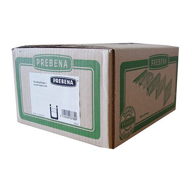 Chiodi per strisce Tipo RK31/80BK Gambo liscio Lunghezza del chiodo 80 mm Dimensione del filo Ø 3,1 mm Versione Caricatore in plastica Pezzi/scatola 3.000 Peso per scatola 15,6 kg Unità di imballaggio 1 x 3.000 -- I chiodi a nastro Prebena RK (chiodi a testa tonda) da 50 a 160 mm - dimensione del filo: 2,9 - 4,6 mm - caricatore in plastica - inclinazione 20° sono compatibili, tra gli altri, con i seguenti dispositivi o sistemi: BeA - R 20 Bostitch - KN Bostitch - PL 21° Dewalt - chiodi a striscia ST 20° Duofast - chiodi a nastro SN Haubold - RB 29/50 - RB 50/160 Hitachi - Chiodi a striscia ST 20° Holzher - Chiodi a striscia Mafell - Chiodi da 2,7x55 a 3,4x100 Max - Chiodi a striscia ST 20° Paslode - Chiodi da magazzino in plastica dura Powerfix - ST 20 Schneider - RN 29/65 - RN 34/100 Senco - Chiodi a nastro MC/OC Würth - Chiodi a nastro 20° I chiodi PREBENA a gambo liscio sono conformi alla norma DIN 1052 Parte 2 (resistenza alla trazione del filo del chiodo, diametro della testa