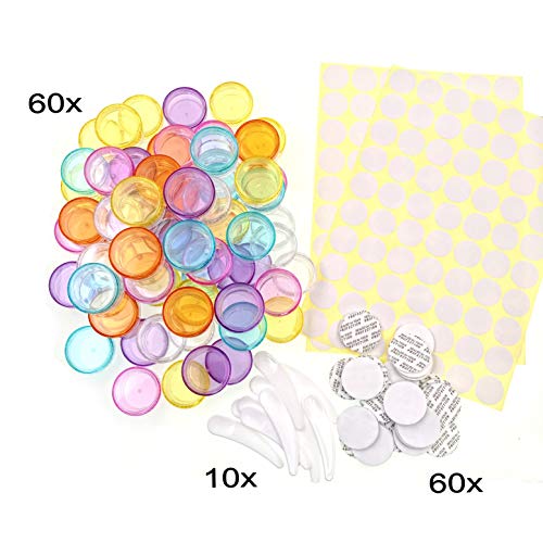 Confezione contiene: 60 x rotondi trasparenti multicolore 5 ml contenitori per campioncini cosmetici con coperchi in plastica + 10 x mini spatola + 140 x adesivi rotondi bianchi + 60 x sigilli. Colori misti: trasparenti, rosa, viola, blu, giallo, arancione. 10 Pezzi per colore.