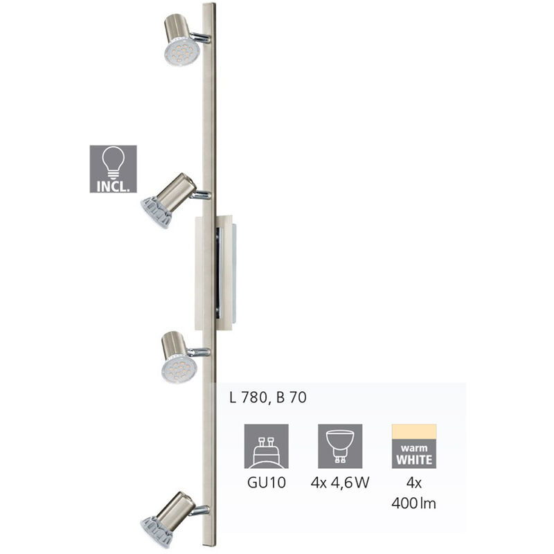 Eglo ROTTELO L / B / H / diametro in mm: 780/70 / - / - peso in kg: 1.419 incluso lampade: sì sorgente luminosa: max GU10 LED . Dimmerabile 4X5W lampade: Watt lampadina SI luminosità in lumen: - temperatura di colore in Kelvin: - Classe efficienza energetica: A + di protezione: IP20 interruttore: no sensore: no commutabile: si ulteriori informazioni