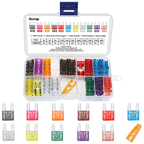 Rovtop Mini Car Fuses,150pcs Assorted Auto Car Truck Mini Blade Fuses Assortment (2A 3A 5A 7.5A 10A 15A 20A 25A 30A 35A 40A) With1 Fuse Extrator 1 Carrying Storage and1 pastable instruction