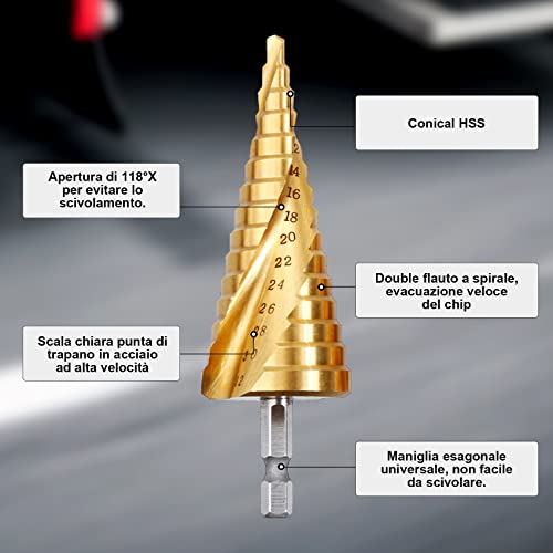【Il pacchetto include】3 * HSS fresa conica, 1 * custodia.Trapano a Gradini comprende tre taglierine coniche in acciaio con dimensioni di 4-12mm, 4-20mm e 4-32mm, che coprono una varietà di dimensioni del passo.