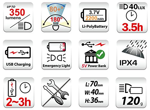 Visione in avanti di 80° estremamente ampia e ampia illuminazione laterale di 180° alimentata da un centro LED CREE XPG2 molto potente e 2 LED laterali con ottica delle lenti ottimizzata. 3 modalità di Luminosità: 300, 200 e 120 Lumen per rispettive 3, 4 e 7 ore