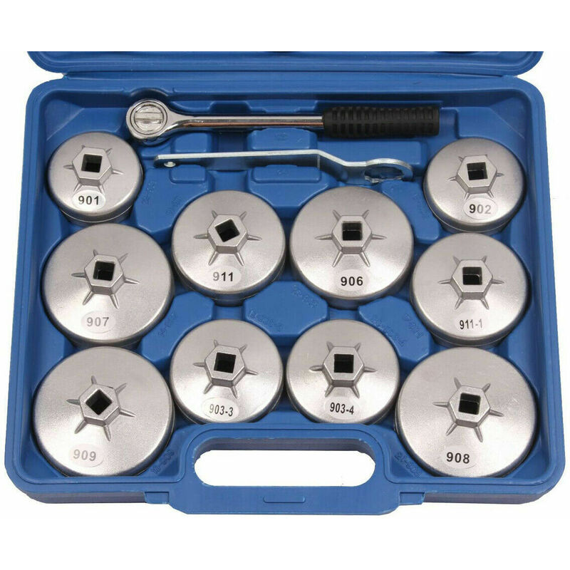 Il nostro set formato da 21 chiavi a tazza é ideale per chi é alla ricerca di un prodotto professionale e di qualitá. Caratteristiche tecniche: Chiave a tazza filtro olio 21 boccole 901 65m/m p-14 902 67m/m p-14 903 74m/m p-14 903-1 75m/m p-15 903-2 74m/m p-15 903-3 74m/m p-15 903-4 73m/m p-14 903-6 75m/m p-18 903-7 74m/m p-15 904 79m/m p-15 905 73m/m p-15 905-1 74m/m p-14 906 84m/m p-18 907 89m/m p-15 908 91m/m p-15 909 82m/m p-15 910 95m/m p-15 911 76m/m p-12 911-1 79m/m p-15 915 92m/m p-15 914 101m/m p-15 Chiave a cricchetto Chiave ad anello Materiale: lega metallica Peso complessivo: 3.820 kg circa La confezione contiene: Nr. 21 boccole a tazza Nr. 2 chiavi
