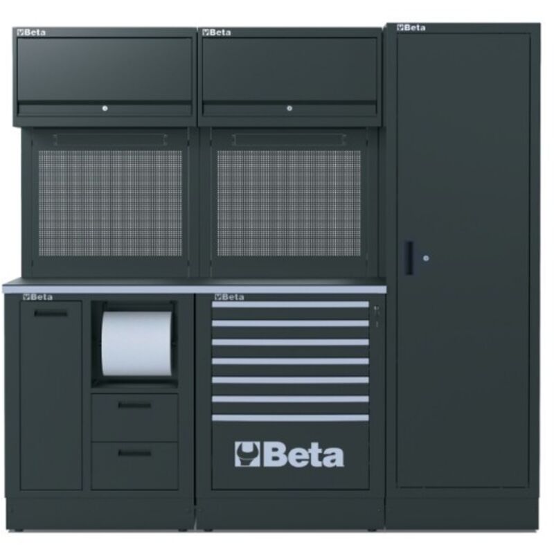 La combinazione completa arredamento officina 050001015 Beta RSC50 C è una soluzione professionale per la realizzazione di officine, perfetta per garantire tutto lo spazio necessario per riporre la propria dotazione e per eseguire le lavorazioni quotidiane sull'apposito banco da lavoro.La nuova linea Beta RSC50 è progettata e realizzata presso stabilimenti italiani garantendo la massima qualità nella selezione dei materiali ed una particolare attenzione ad ogni dettaglio.Queste officine modulari sono totalmente personalizzabili per adattarsi a tutte le situazioni: potrete infatti scegliere sia una soluzione preimpostata che realizzare la propria soluzione su misura. La nuova Beta RSC50 offre maggior spazio di lavoro grazie ad un piano di appoggio più profondo da 63 centimetri, realizzato in lamiera rivestita in PVC anti urto, anti graffio e resistente agli idrocarburi, quindi indicato anche per utilizzi gravosi.Le cassettiere offrono ampio spazio per riporre i propri