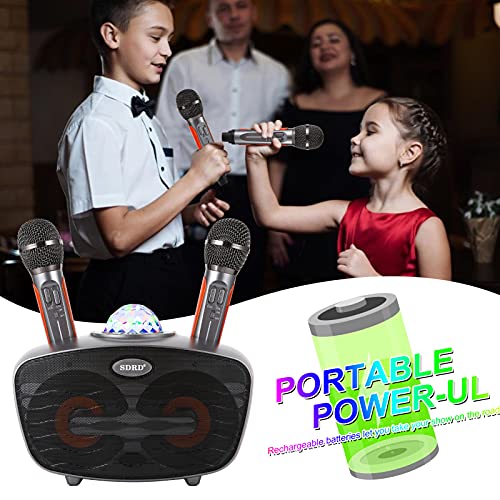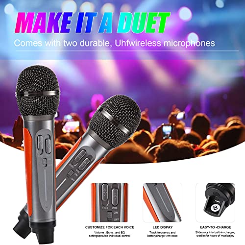 Durata della batteria a lunga durata: batteria agli ioni di litio ricaricabile integrata da 7,4 V/3000 mAh per l'altoparlante e batteria agli ioni di litio ad alta capacità da 3,7 V/1500 mAh per il microfono fornisce musica senza interruzioni fino a 3,5 ore con volume massimo. E l'altoparlante funziona come stazione di ricarica, quindi possono essere facilmente caricati nel frattempo. E segnale wireless stabile per oltre 80 piedi, puoi cantare ciò che vuoi liberamente.