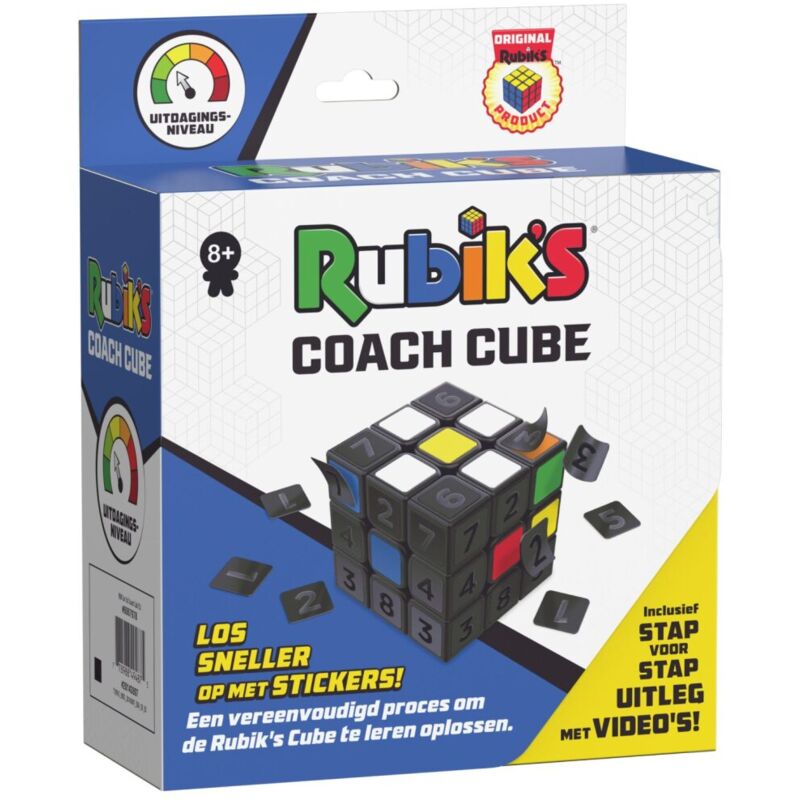 Cubo Coach di Rubik Risolvi il puzzle più velocemente con gli adesivi. Utilizza gli otto passaggi del metodo di rivelazione per imparare a risolvere il puzzle utilizzando la guida passo passo e i video inclusi. Con questo metodo, all'inizio del cubo sono presenti adesivi neri e numerati. Segui la guida e i video per rimuovere gli adesivi e fissare le piastrelle a vista. Prima che tu te ne accorga, hai risolto con successo il cubo. Adatto a bambini dagli 8 anni.