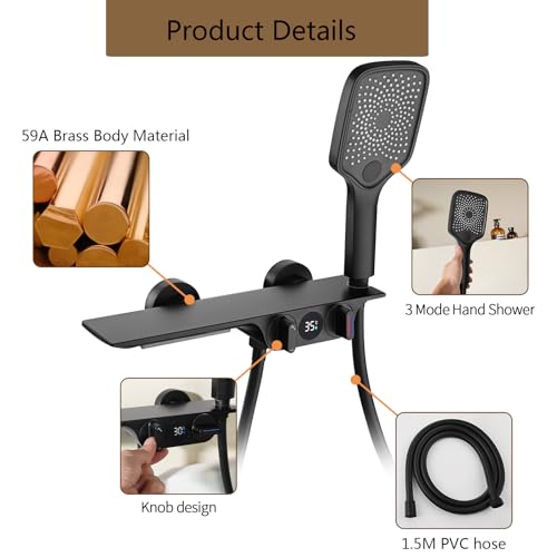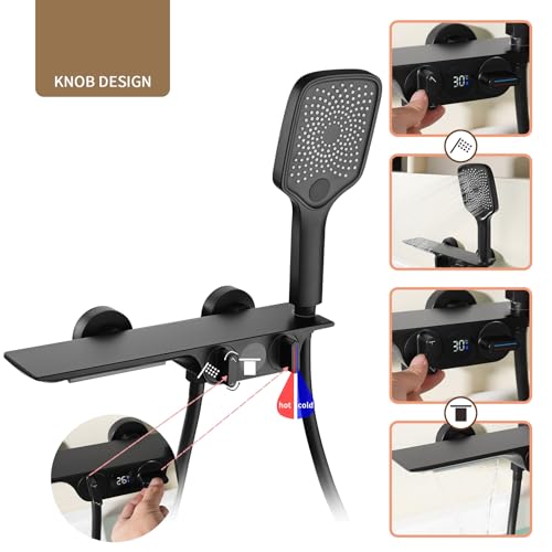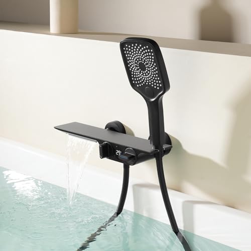 Rubinetti Vasca con Cascata Nero, Rubinetto Vasca da Bagno Con Display Della Temperatura, Rubinetto doccia in ottone, Miscelatore per Vasca da Bagno Con 3 Funzioni Doccetta
