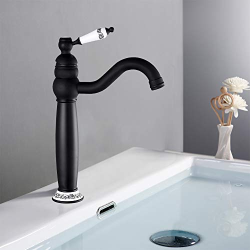 Rubinetto bagno per lavabo vintage in ottone, alto, miscelatore stile antico monocomando, floreale, con tubi caldo e freddo disponibili (Nero)