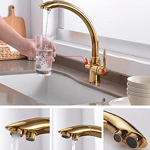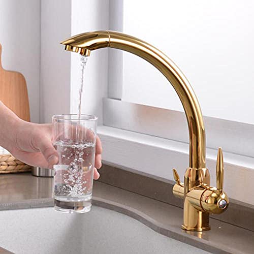 Rubinetto Cucina 3 Vie per Depuratore, Ottone Rubinetto Drittimo Rotazione Calda E Fredda Acqua Rubinetto Della Lavandino-Oro