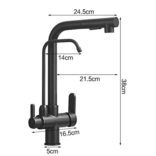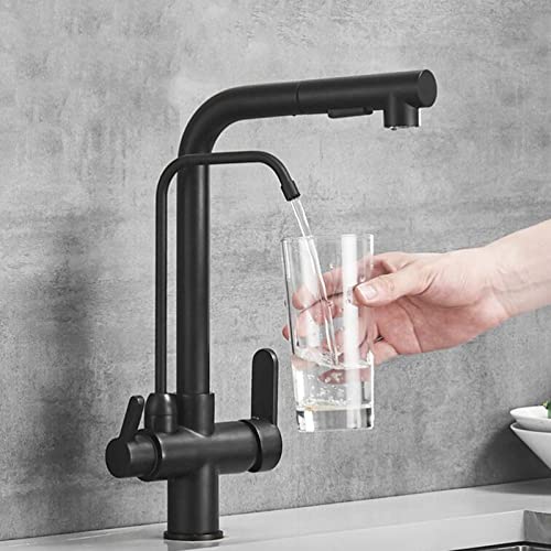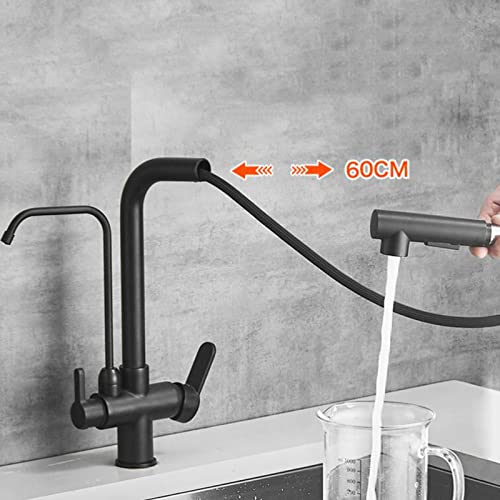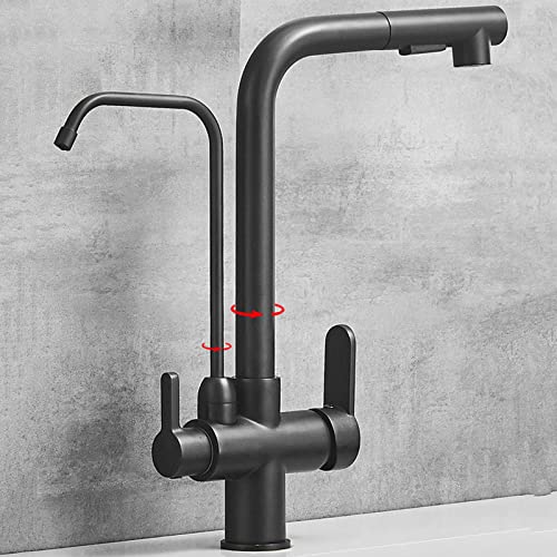 Rubinetto 3 Vie Cucina con Doccetta Estraibile, Rubinetto da Cucina Girevole Acqua Fredda e Calda Ottone Rubinetto per Osmosi A Tre Vie Cucina Nero