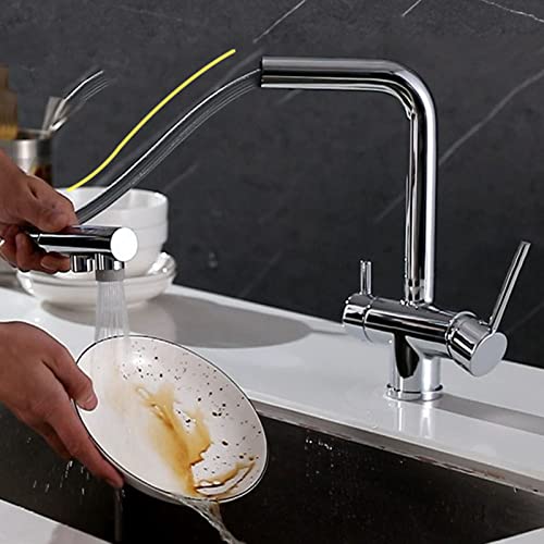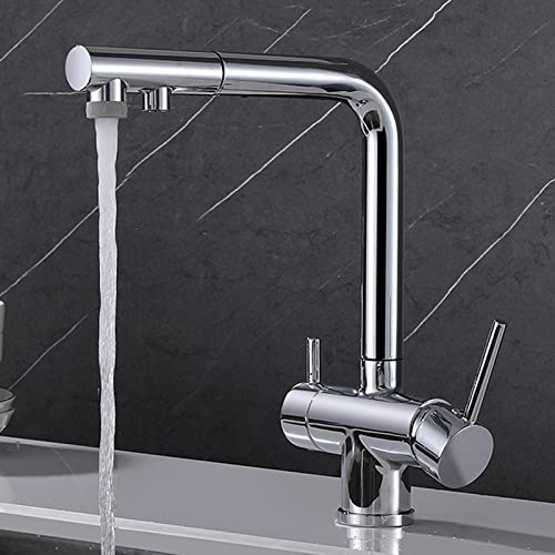 Rubinetto Cucina 3 Vie con Doccetta Estraibile Ottone Acqua Fredda E Calda Acqua Puraa Girevole Multifunzione Rubinetto da Cucina Tre Vie Estraibile-Cromo