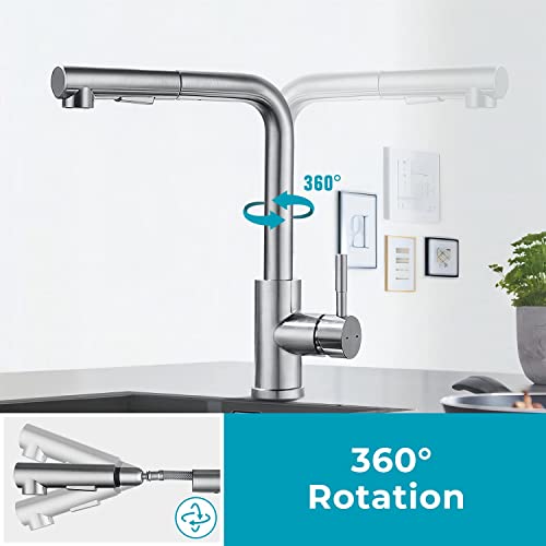 【QUALITA ECCELLENTE】 Il rubinetto lavello cucina è realizzato in acciaio inossidabile SUS304 di alta qualità e il nucleo della valvola in ceramica di alta qualità è stato testato per 700,000 cicli per garantire una durata stabile e lunga. L'affidabilità è una priorità assoluta per i miscelatore cucina.