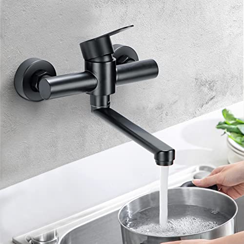 Rubinetto per Cucina a Muro, Rubinetto da Muro Girevole a 360° in Acciaio Inox, Fori di Montaggio Regolabili con Canna Girevole Universale "S", Braccio Girevole 23cm, Nero