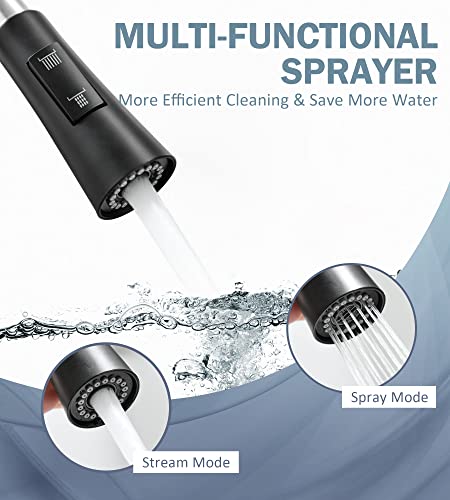 【Doppia modalità】 Il rubinetto nero per lavello da cucina include 2 impostazioni di spruzzo (flusso e spray), la modalità flusso viene utilizzata per riempire l'acqua in modo rapido e preciso nel contenitore senza sputtering, la modalità spray viene utilizzata per sciacquare i piatti e il lavandino di grandi dimensioni, che lo rendono più facile da pulire. Il design liscio a maniglia singola si integra per controllare facilmente la temperatura dell'acqua e il volume del flusso.