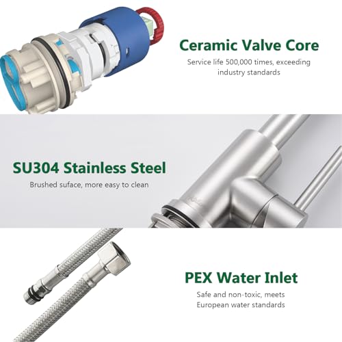 【Affidabile qualità】Ogni nostro rubinetto è realizzato in acciaio inossidabile 304 di alta qualità. Questa particolare lega di acciaio è conosciuta per la sua resistenza alla corrosione, alla sporcizia e per la sua durata nel tempo, permettendo ai nostri rubinetti di resistere alla prova del tempo.