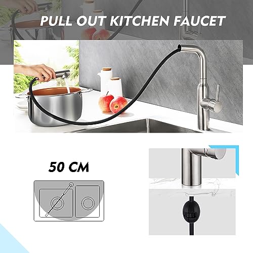 ▶ Beccuccio multifunzione: beccuccio girevole a 360 gradi, per raggiungere ogni angolo del lavello. Bocca estraibile con due funzioni per un getto delicato e per l'acqua della doccia, pratica per le diverse esigenze. Beccuccio con un lungo tubo estraibile che facilita il riempimento di pentole e padelle di grandi dimensioni, progettato per una distanza di oltre 50 cm, per soddisfare le vostre esigenze specifiche, è una buona idea per lavelli singoli o doppi.