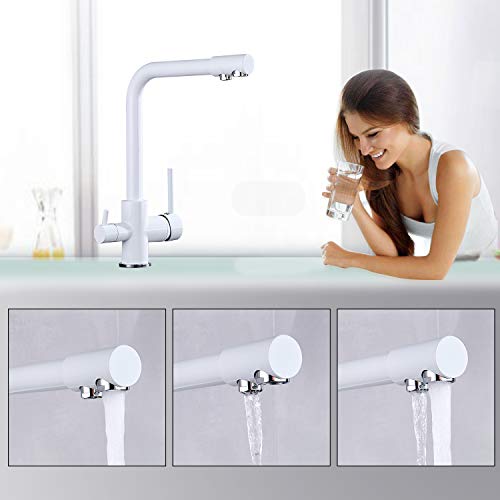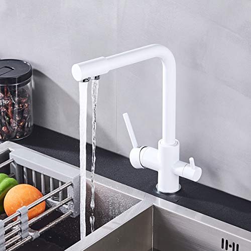 SUGU - Rubinetto ad alta pressione a 3 vie, per acqua potabile della cucina, 2 maniglie, girevole a 360°, miscelatore con sistema del filtro, colore bianco