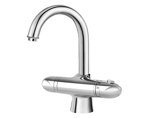 RAF - Rubinetto termostatico per lavabo con termostato italiano cromato in ottone montaggio su piano con pulsante di sicurezza e scarico automatico