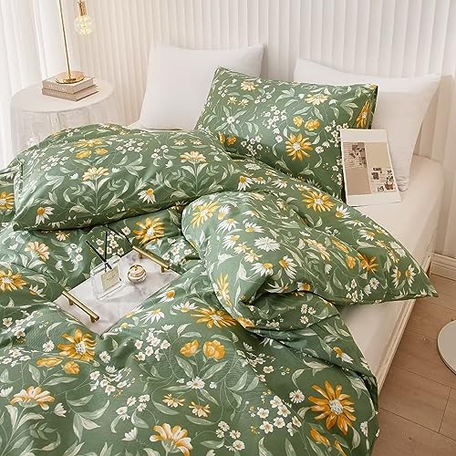 Ruccit Set copripiumino verde floreale per letto king size, 100% cotone, 3 pezzi, fiori gialli e bianchi, con chiusura a cerniera, lacci agli angoli, morbido, resistente, facile da pulire