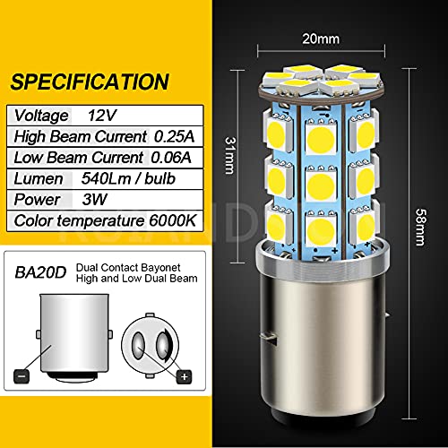 Ruiandsion - Lotto di 2 lampadine LED BA20D da 12 V per fari da moto, super luminose, 5050 27 SMD, chipset LED, luce High Low, fascio 6000 K, luce bianca