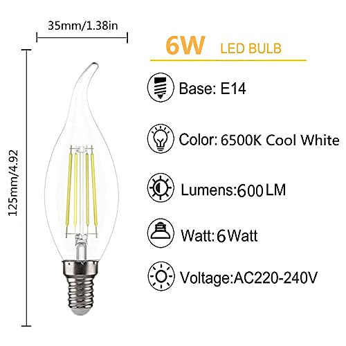 Ruihua E14 Lampadina a Filamento LED da 6W Bianco Freddo 6500K(Equivalente Lampadina alogena da 60W) Non Dimmerabile Lampada a Risparmio Energetico 600LM C35 Lampadine a Candela,Confezione da 15