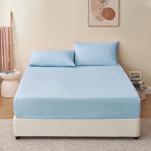 RUIKASI Lenzuolo con Angoli per Letto Blu - Lenzuolo sotto con Angoli Piazza e Mezza Francese Blu Chiaro in Microfibra 90x200 +30 cm Bed Fitted Sheet
