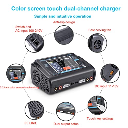 ✔ Touchscreen: con il touchscreen è molto semplice utilizzare il caricabatterie. D'altra parte, la tensione di ingresso (CA: 100 V-240 V, CC: 11 V - 18 V) e dimensioni ridotte, che possono farti caricare rapidamente la batteria e portarla ovunque tu voglia andare.
