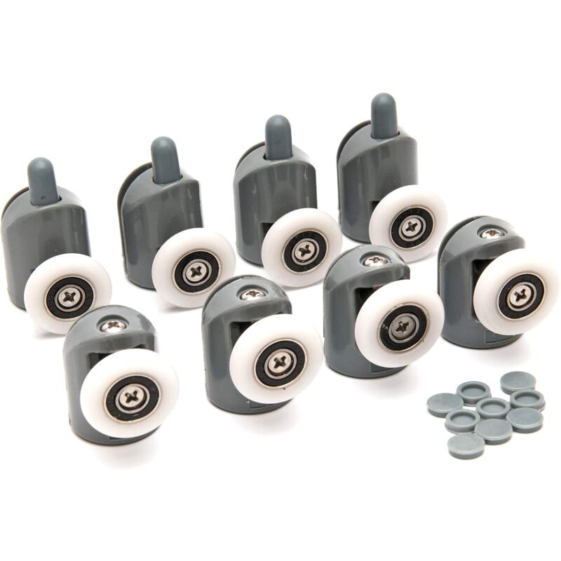 larghezza: 5 mm Dimensione minima del foro del vetro: 11 mm La confezione include: 4 rulli superiori per porte doccia + 4 rulli inferiori per porte doccia.