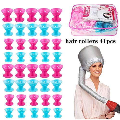 40PZ Rullo Bigodino Silicone, blu e rosa 20 pezzi grandi e 20 pezzi piccoli rulli per capelli in silicone con 1 cofano cofano asciugacapelli kit di strumenti per capelli